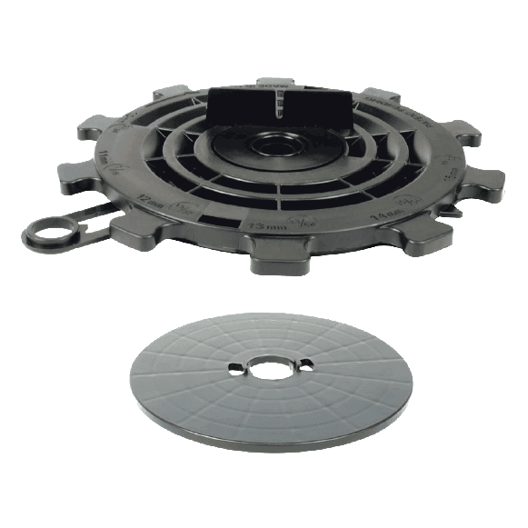 An optional 1/8" thick anti-slip, cushioning, rubber base ring is available for use on membranes, etc. This effectively reduces transmitted noise where decks are mounted on balconies or roof areas, as well as for floors in multi-occupancy buildings.